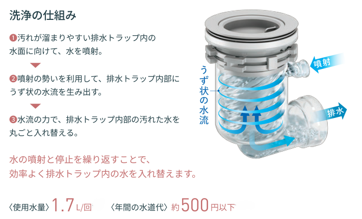 排水トラップ側面に付いた噴射口から水を噴射し、うず状の水流によって内部の汚れた水を流します。この洗浄動作と日常的にシンクで使う水・お湯・洗剤成分などと合わせて、ヌメリの発生を抑制し、嫌な臭いも軽減します。