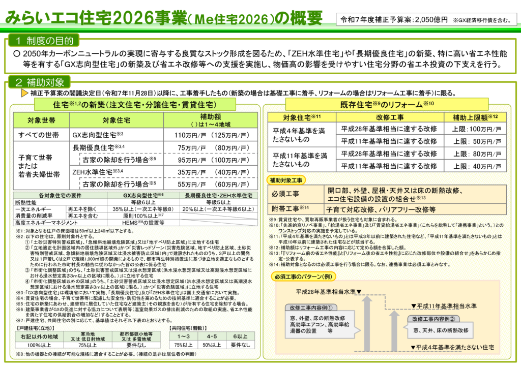 国土交通省は、2050年カーボンニュートラルの実現に向け、住宅の省エネ化を強化する新たな支援制度 「みらいエコ住宅2026事業」 を公表しました。
